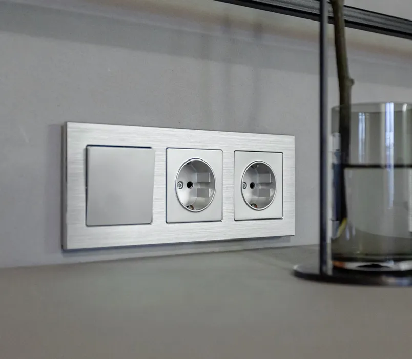 Особое внимание уделили электроустановочным изделиям. В проекте использовались розетки и выключатели торговой марки Werkel™, обрамленные строгими металлическими рамками из серии Aluminium. Эффектная шлифованная поверхность рамок гармонично сочетается с механизмами в серебряном цвете, подчеркивая минималистичный характер интерьера. Такие детали стали важным элементом общего дизайна, добавляя ему завершенности и современности.